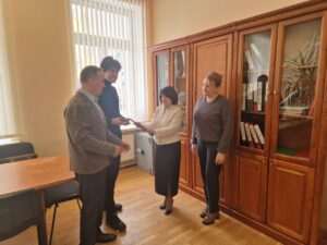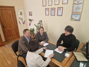 Директор лицея №1 Т.Н. Хорава вместе с помощником генерального директора А.В. Жолнерчиком, начальником отдела кадров С.Э. Саук и молодым специалистом-инженером Э.А. Артюхом обсудили конкретные вопросы профориентационной работы .